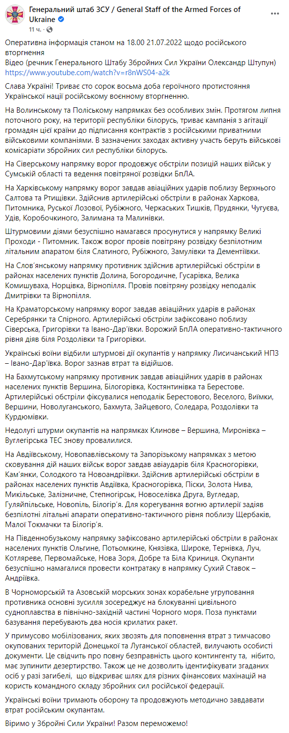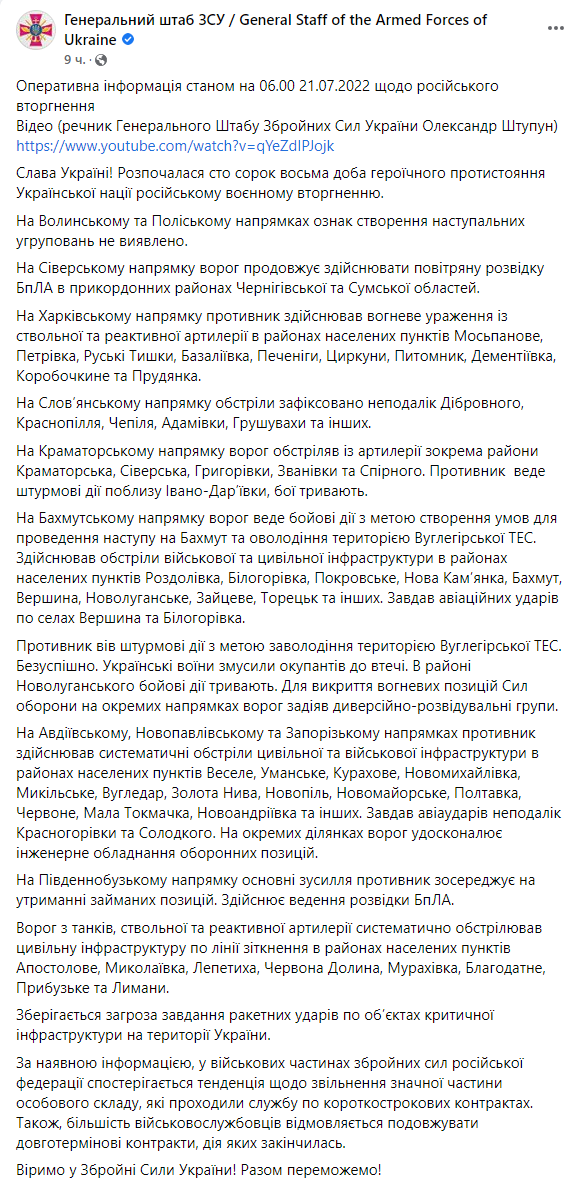 Генеральний штаб ЗСУ: Загальні бойові втрати противника з 24.02 по 21.07 орієнтовно склали: