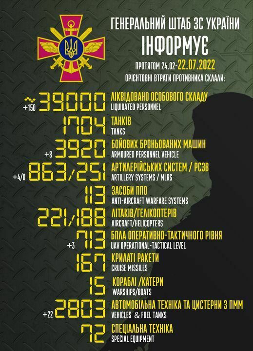 Генштаб ЗСУ: Найбільші втрати загарбники зазнали на Криворізькому та Бахмутському напрямках. Загальні бойові втрати окупантів з 24.02 до 22.07 орієнтовно склали: