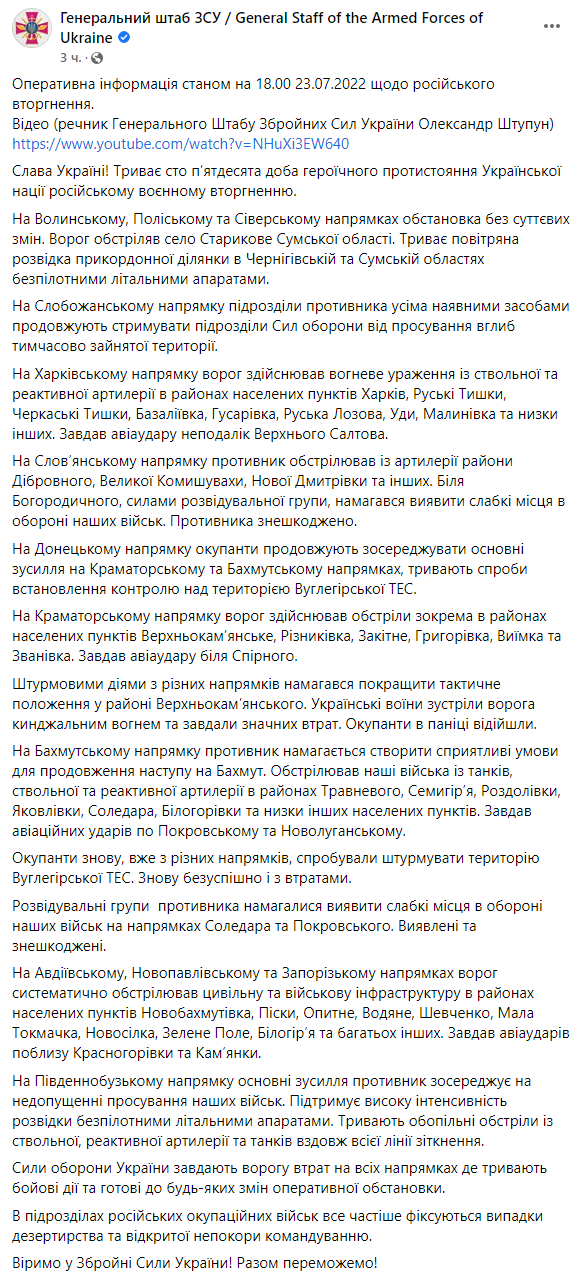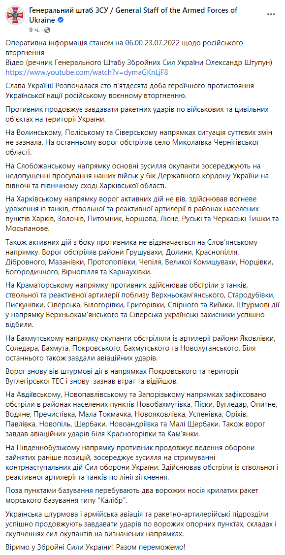 Генеральний штаб ЗСУ: Загальні бойові втрати противника з 24.02 по 23.07 орієнтовно склали: