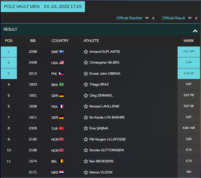 Швед собі сам з собою змагається на цих чемпіонатах. Неймовірний розрив від першого місця до інших медалістів