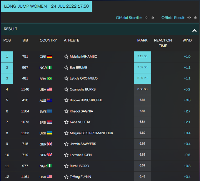 Переможцем стала фаворит Малайка Міхамбо з Німеччини, стрибнувши на 7.12 м.
