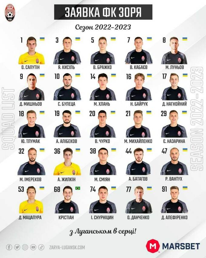 25 гравців. Зоря опублікувала заявку на сезон