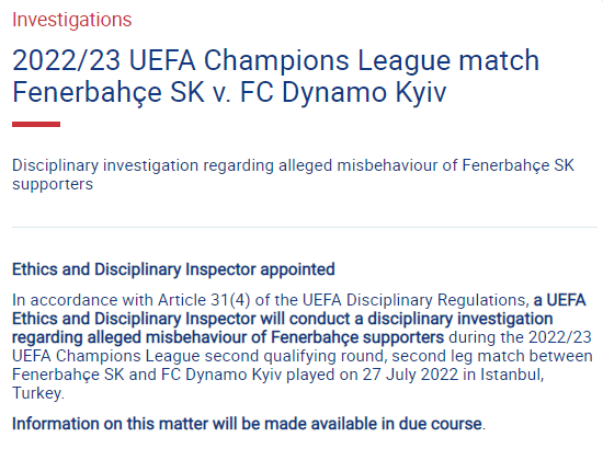 На сайті УЄФА повідомляється: «Згідно зі статтею 31(4) дисциплінарного регламенту УЄФА інспектор УЄФА з етики та дисципліни проведе дисциплінарне розслідування щодо можливої неправомірної поведінки вболівальників «Фенербахче» під час матчу-відповіді другого кваліфікаційного раунду Ліги чемпіонів 2022/23 між «Фенербахче» та київським «Динамо» 27 липня 2022 року в Стамбулі, Туреччина».