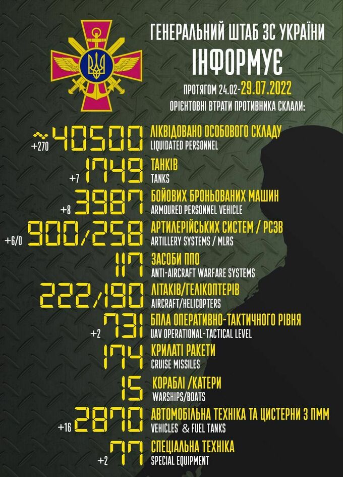 Пропонуємо до вашої уваги зведення загальних бойових втрат росії з 24.02 по 29.07.
