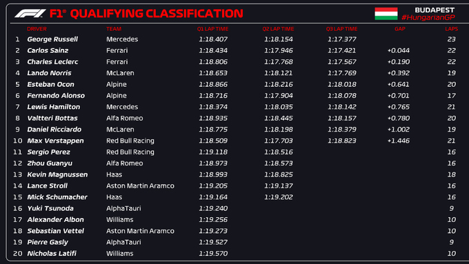 Відбулася кваліфікація у рамках Гран-прі Угорщини. Поул несподівано виграв пілот Мерседеса Джордж Расселл. Це перший поул команди у сезоні та дебютний поул для британця.