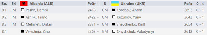 Чоловіча збірна України обіграла команду Албанії (4:0). Перемоги здобули Антон Коробов, Юрій Кузубов, Кирило Шевченко, Володимир Онищук. У 3-му турі чоловіча збірна України зіграє проти команди Куби.