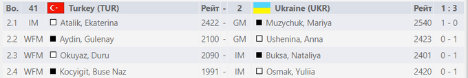 Жіноча збірна України обіграла команду Туреччини (3:1). Свої партії виграли Анна Ушеніна, Наталія Букса, Юлія Осьмак. Несподівано зазнала поразки Марія Музичук на першій дошці від Єкатерини Аталік, але на командну перемогу це не вплинуло. У 3-му турі жіноча українська команда зіграє проти збірної Словаччини.
