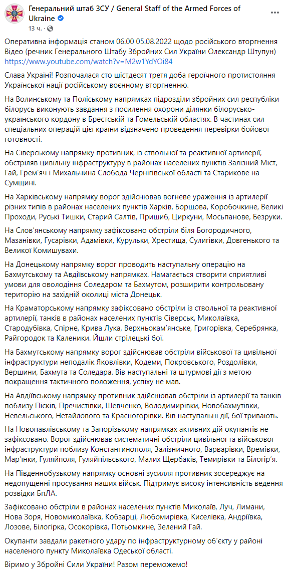 Енергоатом: «5 серпня російські військові знову вдалися до провокацій. Внаслідок їх обстрілу о 14:30 зафіксовано три прильоти біля промислового майданчика ЗАЕС. Ворог влучив у високовольтну лінію зв'язку 330 кВ ВРП автотрансформатора ЗАЕС – Запорізька ТЕС.