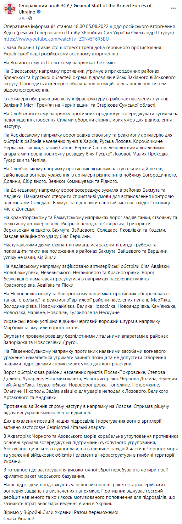Енергоатом: «Ввечері 5 серпня російські терористи повторно обстріляли Запорізьку атомну електростанцію з РСЗВ. Три прильоти зафіксовано прямо на майданчику станції, біля одного з енергоблоків, де знаходиться ядерний реактор.
