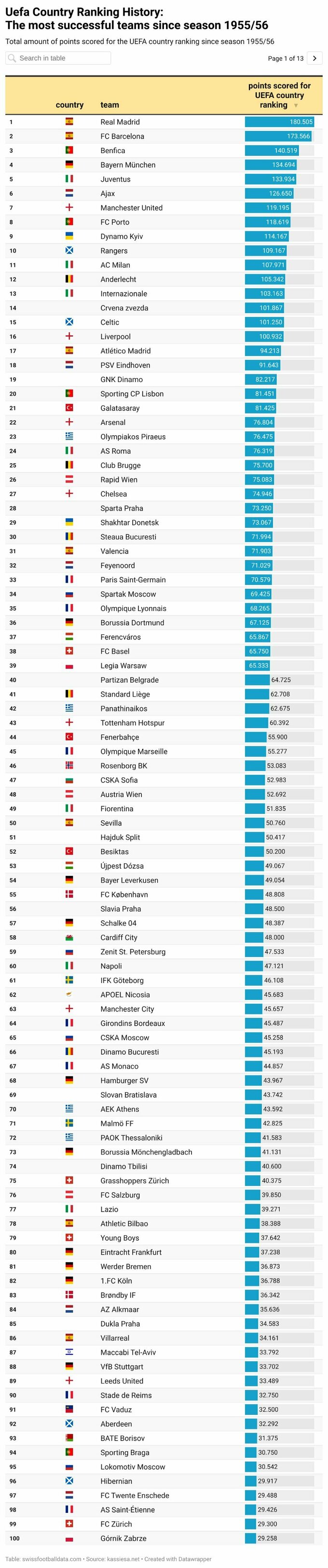 Портал Swiss Football Data склав рейтинг найуспішніших клубів на євроарені, які завоювали найбільше пунктів для своїх асоціацій до таблиці коефіцієнтів із сезону-1955/56.