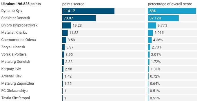 Щодо решти українських клубів, то понад один бал Україні принесли ще 11 клубів.