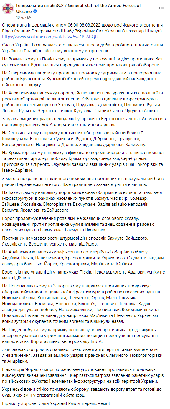 Дані Генштабу ЗСУ: найбільших втрат за минулу добу противник зазнав на Донецькому напрямку. Загальні бойові втрати противника з 24.02 по 08.08 орієнтовно склали: