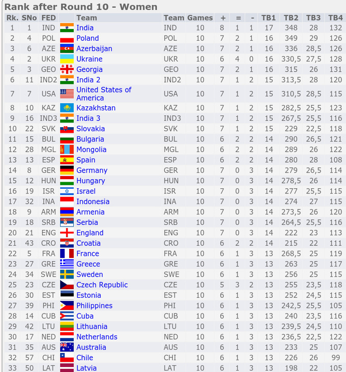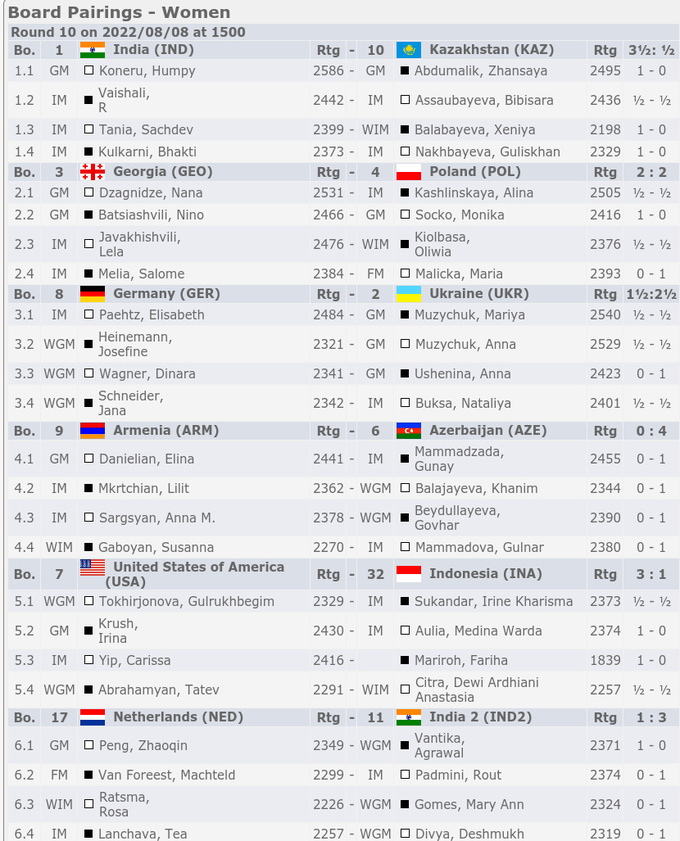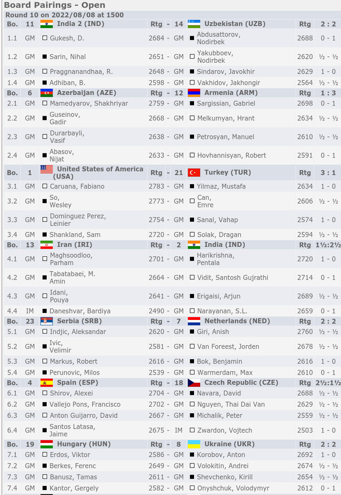8 серпня в індійському Ченнаї відбулися матчі передостаннього 10-го туру шахової Олімпіади 2022.
