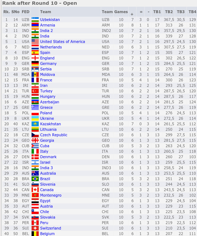 9 серпня на шаховій Олімпіаді відбудеться останній тур. У змаганнях беруть участь 188 чоловічих та 162 жіночих збірних.