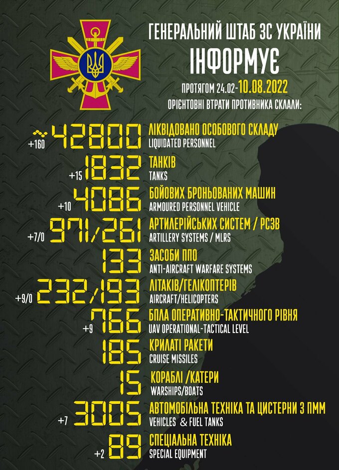 Пропонуємо до вашої уваги зведення загальних бойових втрат росії з 24.02 по 10.08.