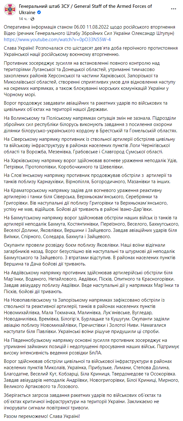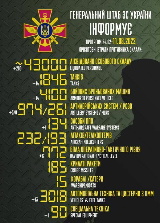 Дані Генштабу ЗСУ: загальні бойові втрати противника з 24.02 по 11.08 орієнтовно склали: