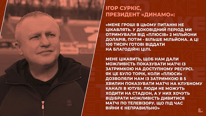 Мене цікавить, щоб нам дали можливість показувати матчі із затримкою на доступному ресурсі. Як це було торік, коли «плюси» дозволяли нам із затримкою в 5 хвилин показувати матчі на клубному каналі в YouTube. Люди не можуть ходити на стадіон, а в них хочуть відібрати можливість дивитися матчі по телевізору, що під час війни неправильно».