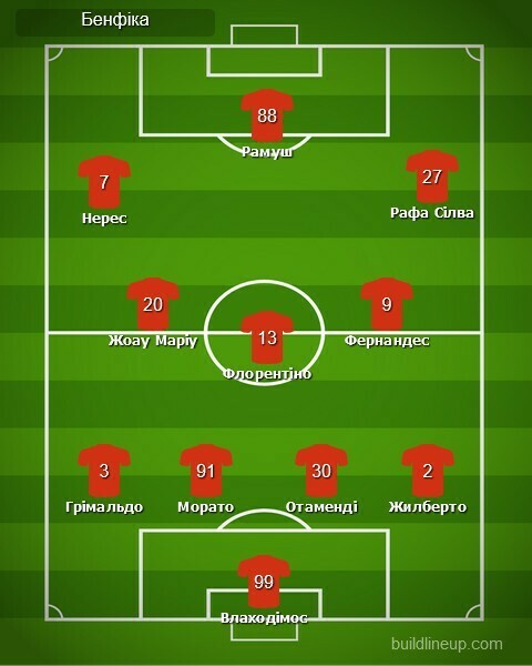 «Бенфіка»: Влаходімос, Грімальдо, Морато, Отаменді, Жилберто (Бах, 69), Флорентіно, Жоау Маріу, Фернандес, Нерес (Араужу, 63), Рафа Сілва (Шикинью, 84), Рамуш (Яремчук, 63).