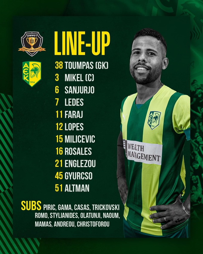 Запасні: Пирич, Стіліанідіс, Олатунджи, Кіпрос, Наум, Андреу.