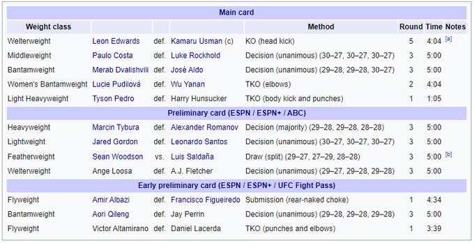 Як фаворит бою, Усман володів ініціативою 24 хвилини з 25, а потім Леон Едвардс хай-кіком сенсаційно шокував нігерійця і відібрав у нього чемпіонський пояс у напівсередній вазі.