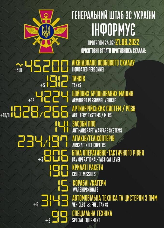 За підсумками 20 серпня загальні втрати російської армії в Україні перевалили за 45 тисяч і становлять 45,2 тисячі (+300 окупантів).