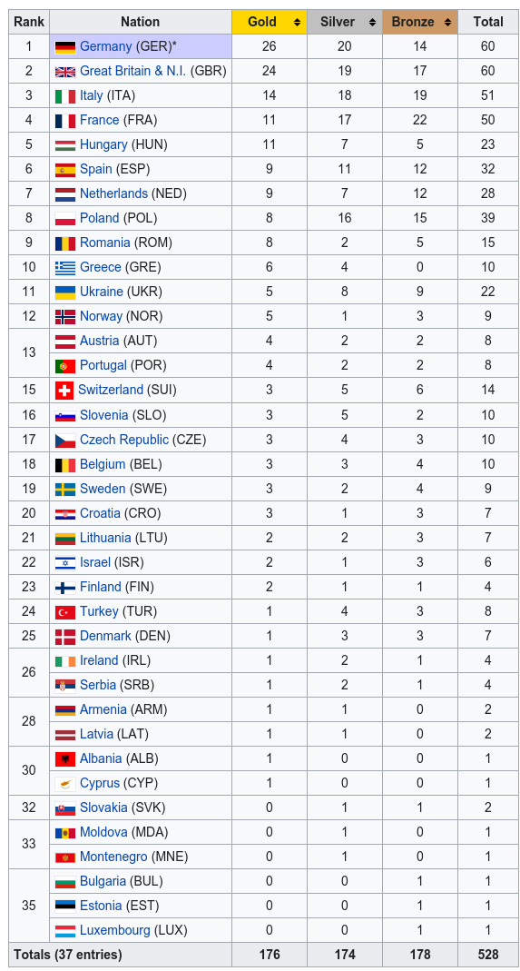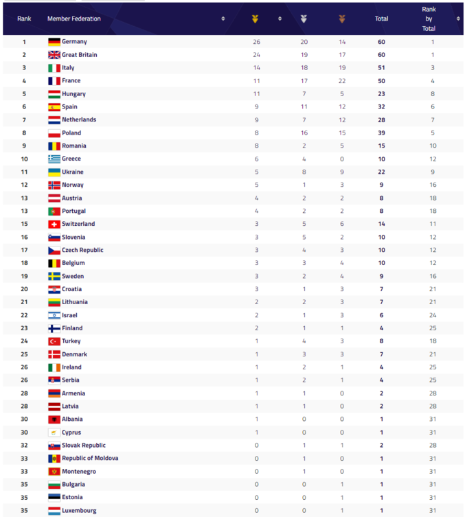 До топ-10 найкращих спортивних збірних континенту увійшли: Німеччина, Великобританія, Італія, Франція, Угорщина, Іспанія, Нідерланди, Польща, Румунія, Греція.