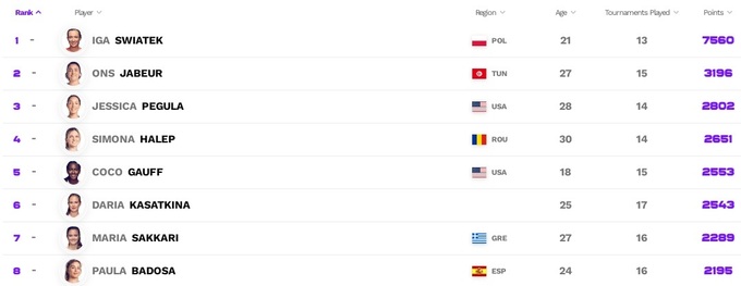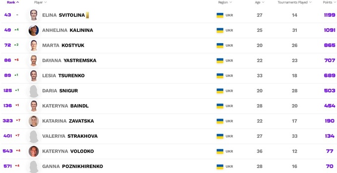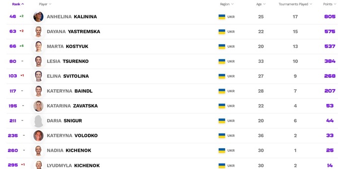 Щодо українок, то Ангеліна Калініна повернулася до першої півсотні, але вона все ще залишається другою ракеткою нашої країни. Марта Костюк, Леся Цуренко та Дар’я Снігур трохи додали, Даяна Ястремська – втратила шість позицій.