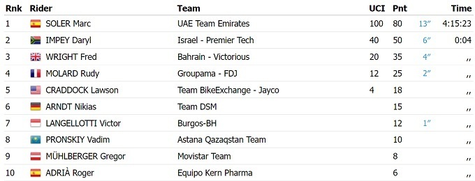 Лідерство у загальному заліку завдяки участі у відриві дня перехопив французький гонщик «Groupama FDJ» Руді Молар.