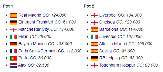 Порядок жеребкування. 32 команди поділили на 4 кошики. У першу чергу потраплять переможці Ліги чемпіонів («Реал» Мадрид) та Ліги Європи («Айнтрахт»), а також чемпіони топ-6 асоціацій рейтингу УЄФА. За трьома кошиками команди розподілені згідно з клубним рейтингом УЄФА.