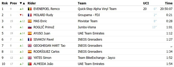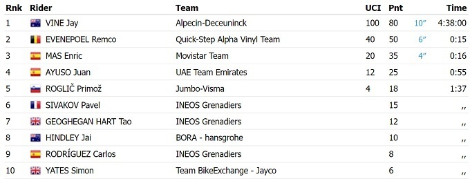 Перемогу на етапі здобув австралієць Джей Вайн із команди «Alpecin Deceuninck». Для нього це перша перемога на професійному рівні. Лідерство у загальному заліку перехопив бельгієць Ремко Евенпул, який більш ніж на хвилину випередив чинного чемпіона Вуельти Пріможа Рогліча.