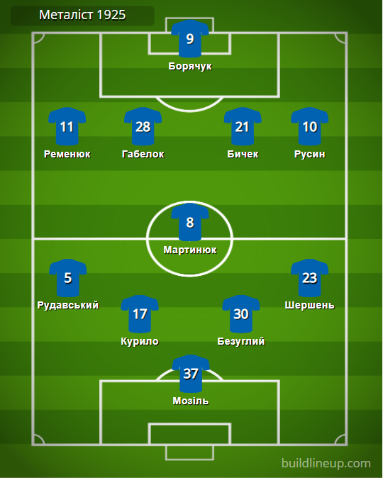 «Металіст 1925»: Мозіль – Рудавський, Курило, Безуглий, Шершень (Капінус, 79) – Мартинюк – Ременюк (Дмитренко, 79), Габелок, Бичек, Русин – Борячук (Д. Кравченко, 79).