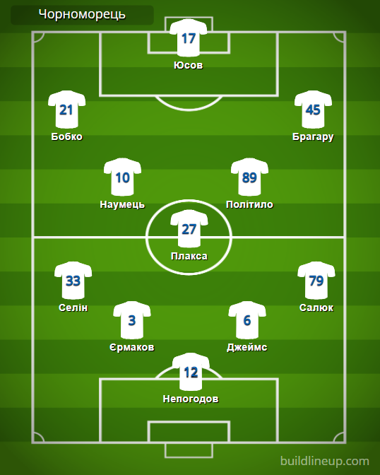 «Чорноморець»: Непогодов – Селін, Єрмаков, Джеймс, Салюк – Наумець, Плакса (Гладкий, 84), Політило – Бобко (Кузик, 72), Юсов (Штогрін, 78), Брагару (Філі, 78).