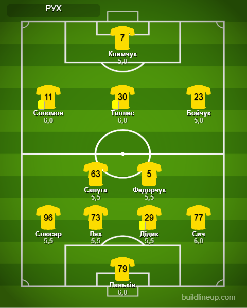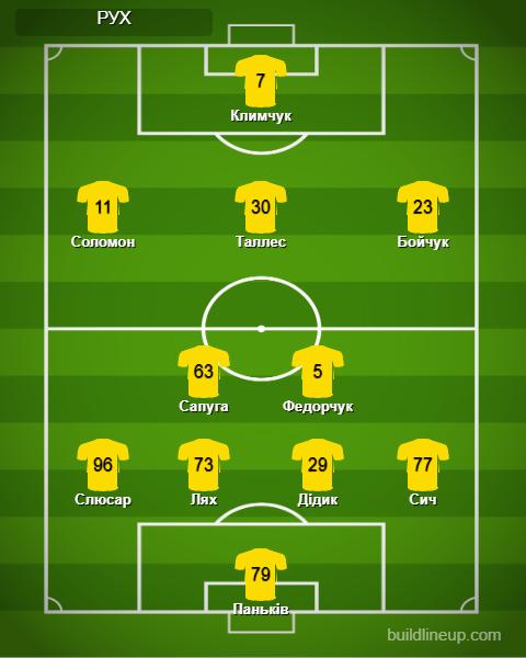 «Рух»: Паньків - Сич, Дідик, Лях, Слюсар - Сапуга, Федорчук - Бойчук (Непейпієв, 65), Таллес (Притула, 81), Соломон (Руніч, 65) - Климчук.