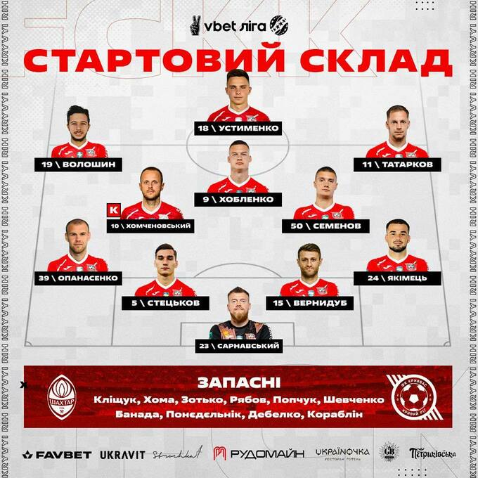 Запасні: Кліщук, Хома, Зотько, Рябов, Попчук, Понєдєльнік, Кораблін.