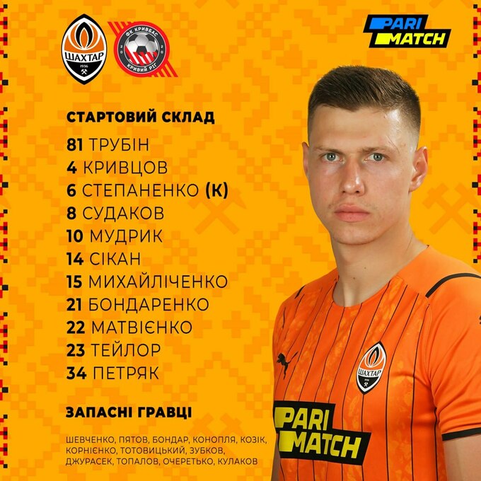 «Шахтар»: Трубін – Михайліченко (Корнієнко, 54, Очеретько, 72), Матвієнко, Кривцов (Бондар, 63), Тейлор (Конопля, 53) – Степаненко – Мудрик, Судаков, Бондаренко, Петряк – Сікан (Зубков, 62).