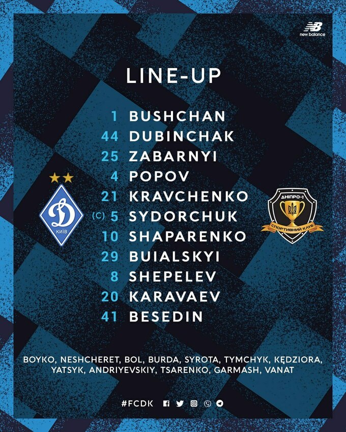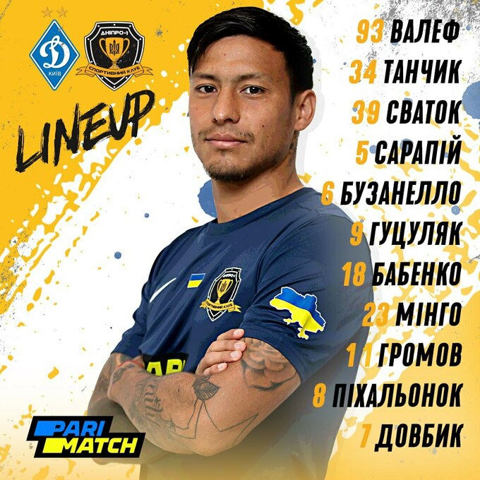 «Дніпро-1»: Валеф, Танчик, Сваток, Сарапій, Бузанелло, Бабенко, Бланко, Громов, Піхальонок, Гуцуляк, Довбик.
