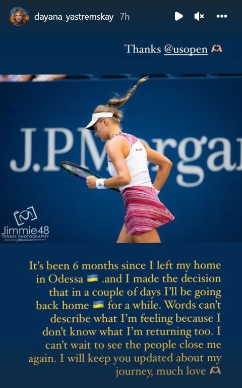 Українська тенісистка Даяна Ястремська, яка вилетіла у першому раунді US Open-2022 від Медісон Кіз, у себе в соцмережах повідомила про те, що планує повернутися до Одеси, незважаючи на війну в Україні: