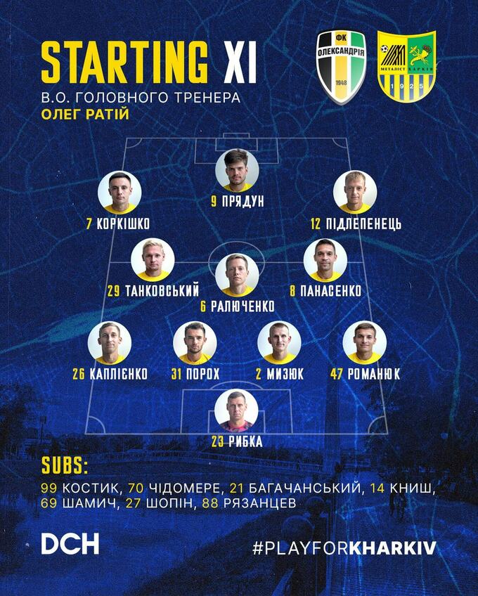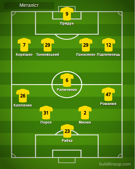 «Металіст»: Рибка – Каплієнко, Порох, Мизюк, Романюк – Ралюченко – Коркішко, Танковський, Панасенко (Шопін, 90+2), Підлепенець (Книш, 69) – Прядун (Рязанцев, 82).