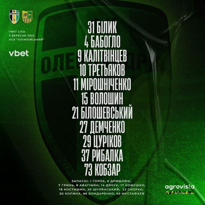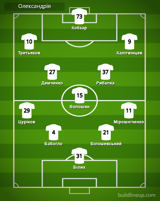 «Олександрія»: Білик – Цуріков, Бабогло, Білошевський, Мірошніченко – Демченко, Волошин (Авагімян, 46), Рибалка (Дришлюк, 75) – Третьяков (Кожушко, 31), Кобзар (Костишин, 46, Бондаренко, 79), Калітвінцев.