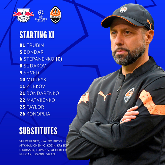 «Шахтар»: Трубін – Конопля, Матвієнко, Бондар, Тейлор – Степаненко (Кривцов, 86) – Мудрик, Судаков, Бондаренко (Джурасек, 62), Зубков (Траоре, 70) – Швед (Петряк, 62).