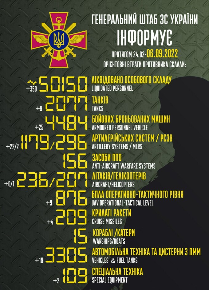 Пропонуємо до вашої уваги зведення загальних бойових втрат росії з 24.02 по 06.09.