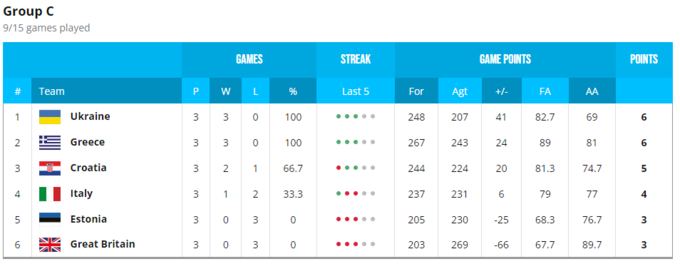 Синьо-жовті стартували на чемпіонаті Європи із трьох перемог – над Великобританією (90:61), Естонією (74:73), Італією (84:73). У складі української команди виступають два гравці з НБА – Святослав Михайлюк та Олексій Лень. Збірна України очолює групу C після трьох турів.