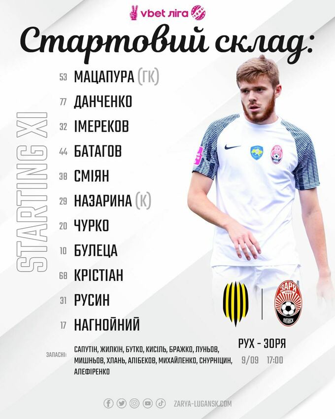 «Зоря»: Мацапура – Сміян, Батагов, Імереков, Данченко (Алефіренко, 83) – Булеца (Бражко, 46), Назарина, Нагнойний (Луньов, 60) – Чурко (Михайленко, 83), Русин, Крістіан.