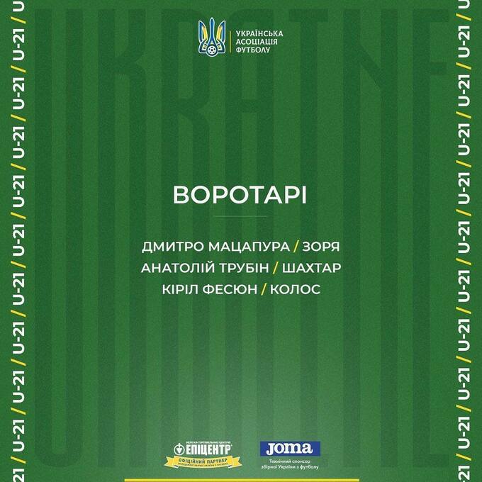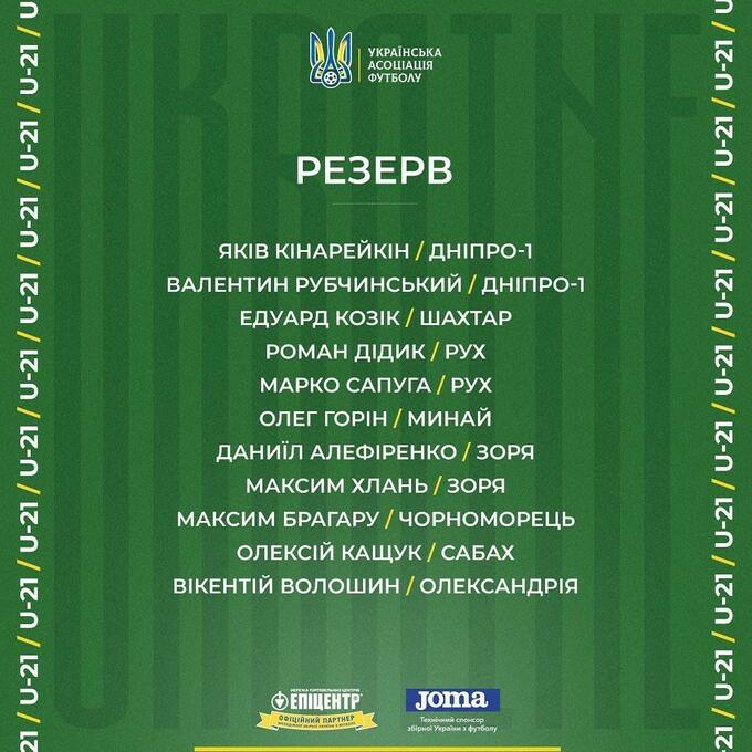 Резерв: Яків Кінарейкін, Валентин Рубчинський (обидва — «Дніпро-1» Дніпро), Едуард Козік («Шахтар» Донецьк), Роман Дідик, Марко Сапуга (обидва — «Рух» Львів), Олег Горін («Минай», Ужгород), Данило Алефіренко, Максим Хлань (обидва — «Зоря» Луганськ), Максим Брагару («Чорноморець» Одеса), Олексій Кащук («Сабах», Азербайджан), Вікентій Волошин («Олександрія»).
