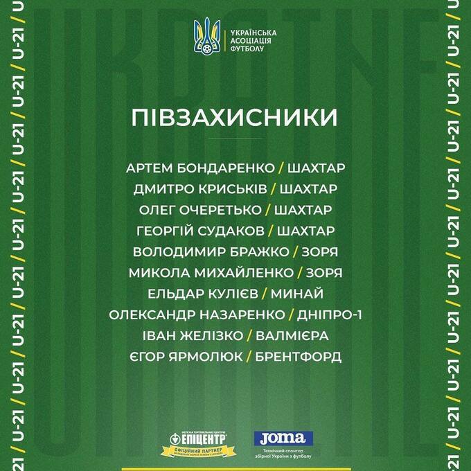 Півзахисники: Артем Бондаренко, Дмитро Криськів, Олег Очеретько, Георгій Судаков (усі — «Шахтар» Донецьк), Володимир Бражко, Микола Михайленко (обидва — «Зоря» Луганськ), Ельдар Кулієв («Минай» Ужгород), Олександр Назаренко («Дніпро-1» Дніпро), Іван Желізко («Валмієра», Латвія), Єгор Ярмолюк («Брентфорд», Англія).