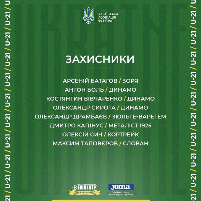 Захисники: Арсеній Батагов («Зоря» Луганськ), Антон Боль, Костянтин Вівчаренко, Олександр Сирота (всі — «Динамо» Київ), Олександр Драмбаєв («Зюльте-Варегем», Бельгія), Дмитро Капінус («Металіст 1925» Харків), Олексій Сич («Кортрейк», Бельгія), Максим Таловєров («Слован», Чехія).