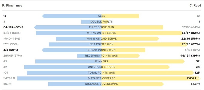 Норвежець Каспер Рууд (№7 ATP) у чотирьох сетах обіграв Карена Хачанова (№31 ATP).