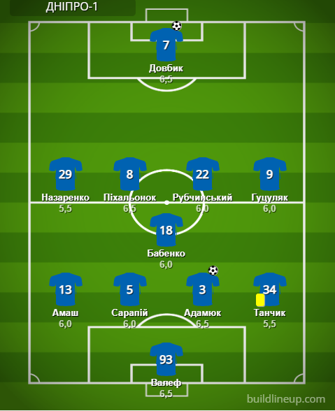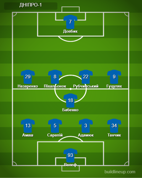 .«Дніпро-1»: Валеф - Танчик, Адамюк, Сарапій, Амаш - Бабенко - Гуцуляк, Піхальонок (Балулі, 79), Рубчинський (Громов, 71), Назаренко (Когут, 71) - Довбик (Горбунов, 85).