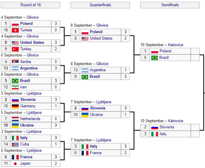 У півфінальних поєдинках грають: 19:00. Польща – Бразилія, 22.00. Італія – Словенія.
