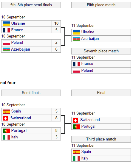 Початок заключного ігрового відрізку повністю залишився за синьо-жовтими. Спочатку Антоні Барботті допоміг автоголом, а потім відзначилися Войтенко, який оформив хет-трик, та Юрій Щериця. Французи дещо скоротили відставання завдяки влучним ударам Сантоса Діаса та Жослена. Крапку в цій результативній зустрічі поставив Медвідь. У підсумку 10:5 – перемога України.